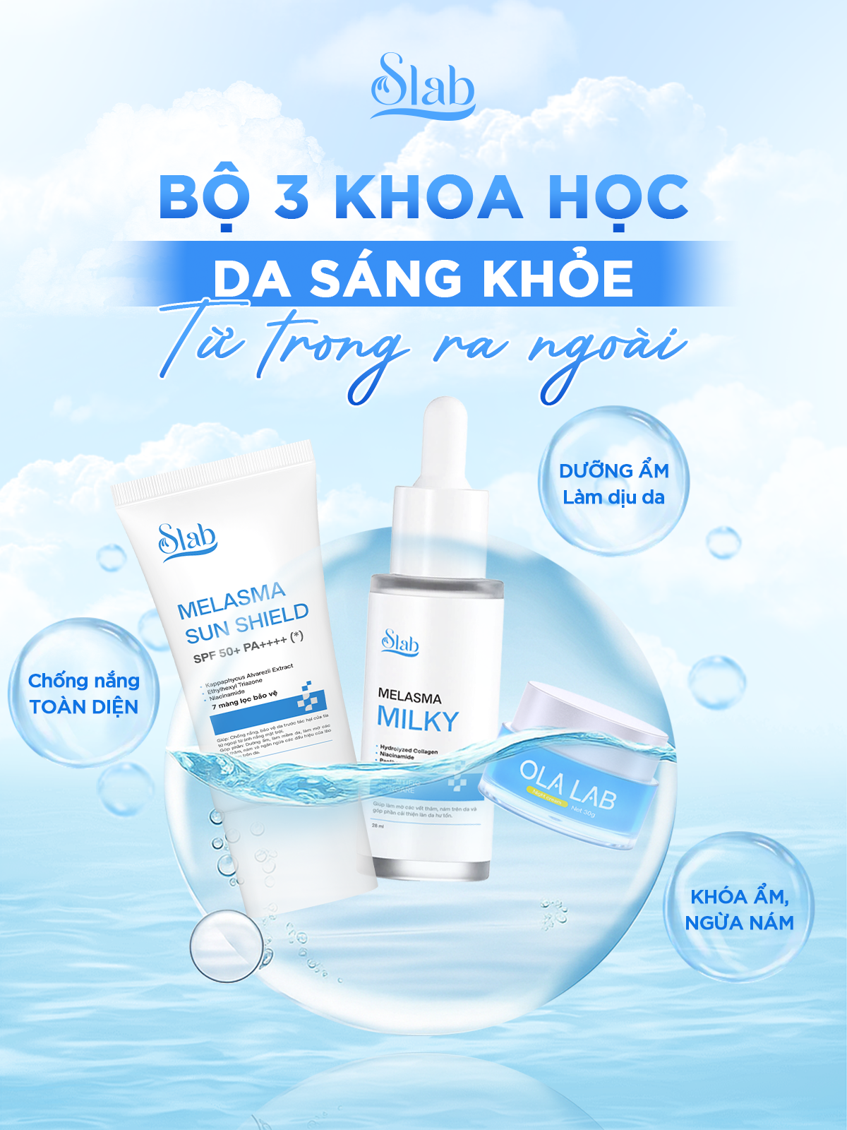 Thay vì lựa chọn serum có hoạt tính mạnh, Slab đề xuất Melasma Milky – serum phục hồi sắc tố chứa Panthenol B5, Niacinamide và Glycerin. Bộ ba hoạt chất này giúp làm sáng nhẹ nhàng, cân bằng sắc tố, giảm thâm sau mụn và làm dịu làn da nhạy cảm mà không gây bong tróc.