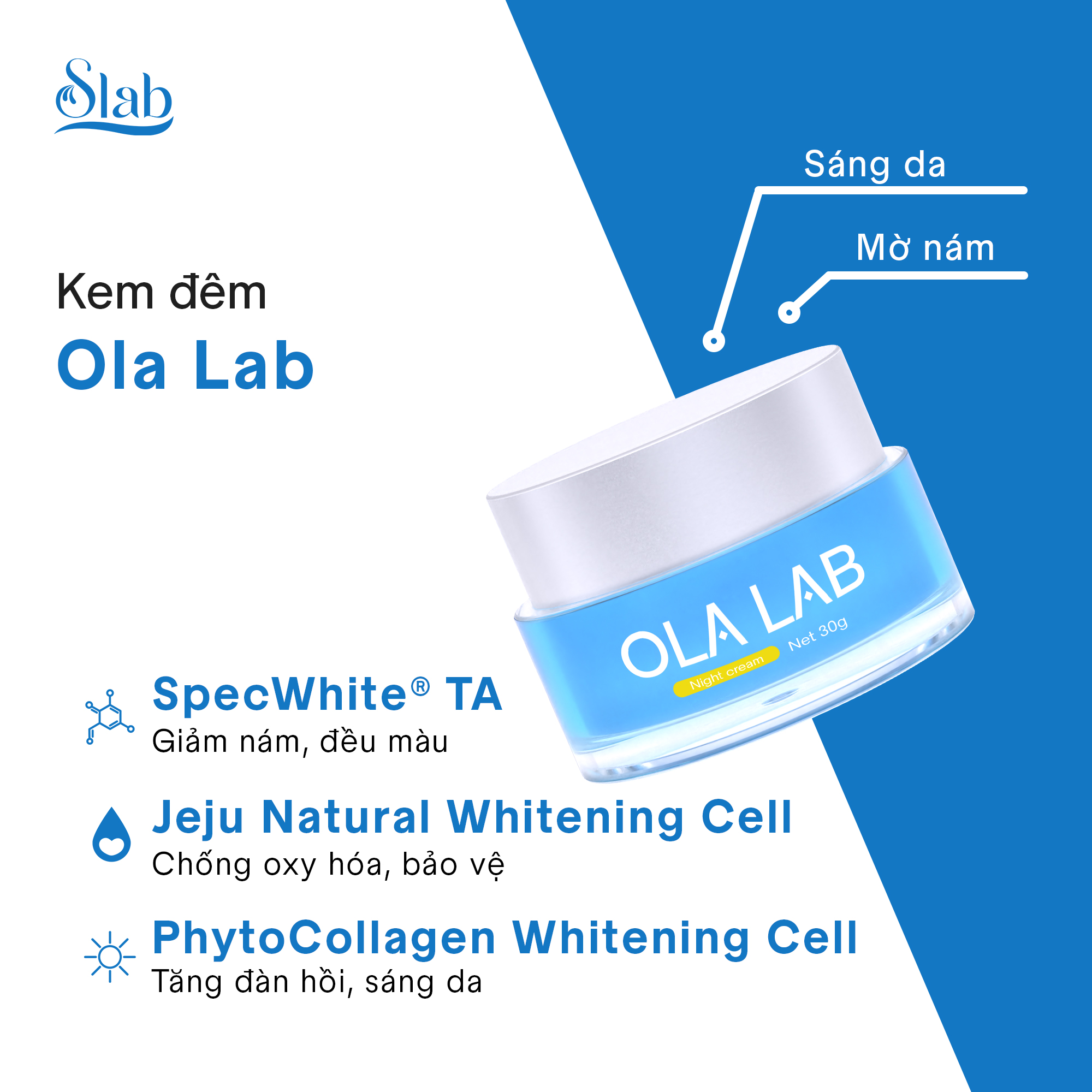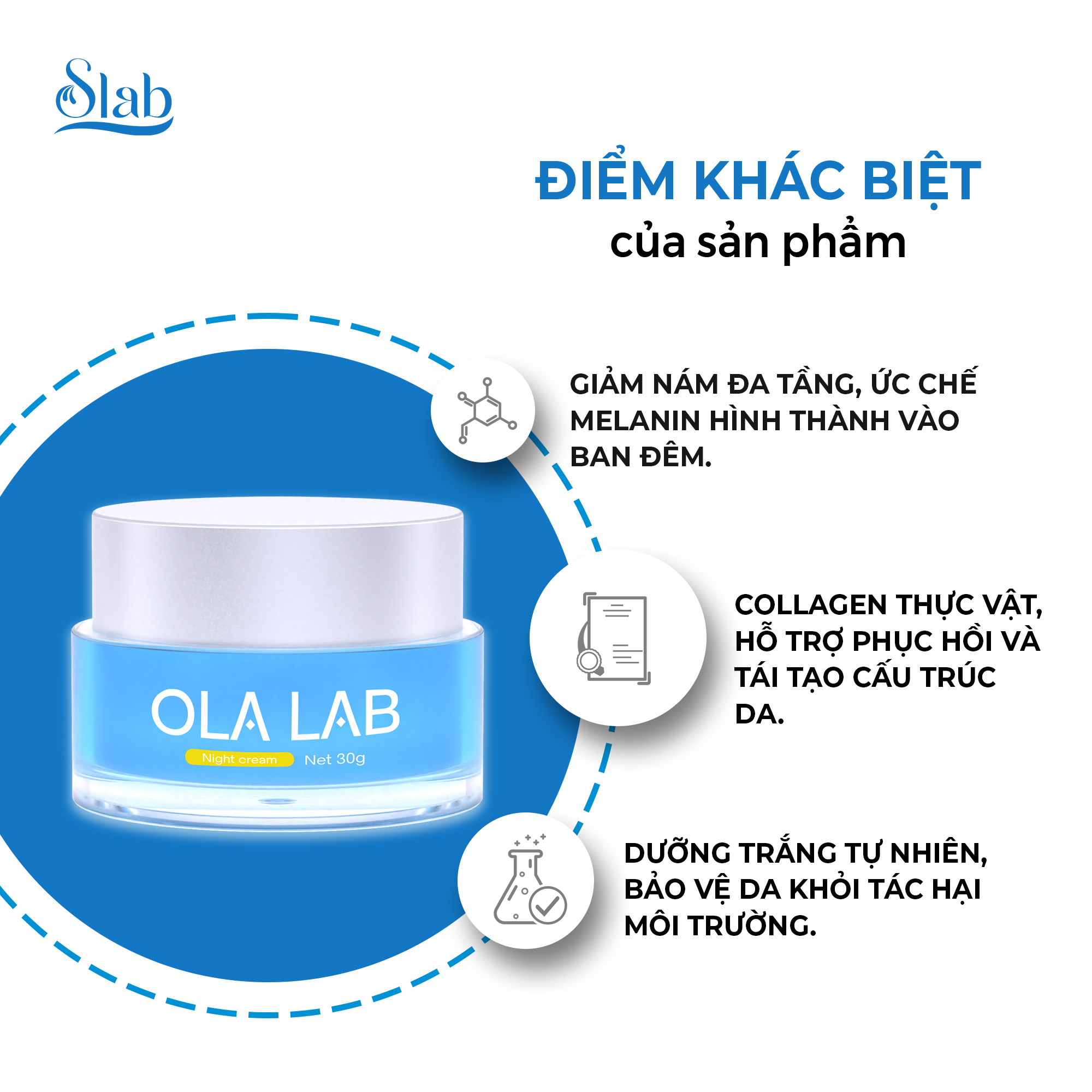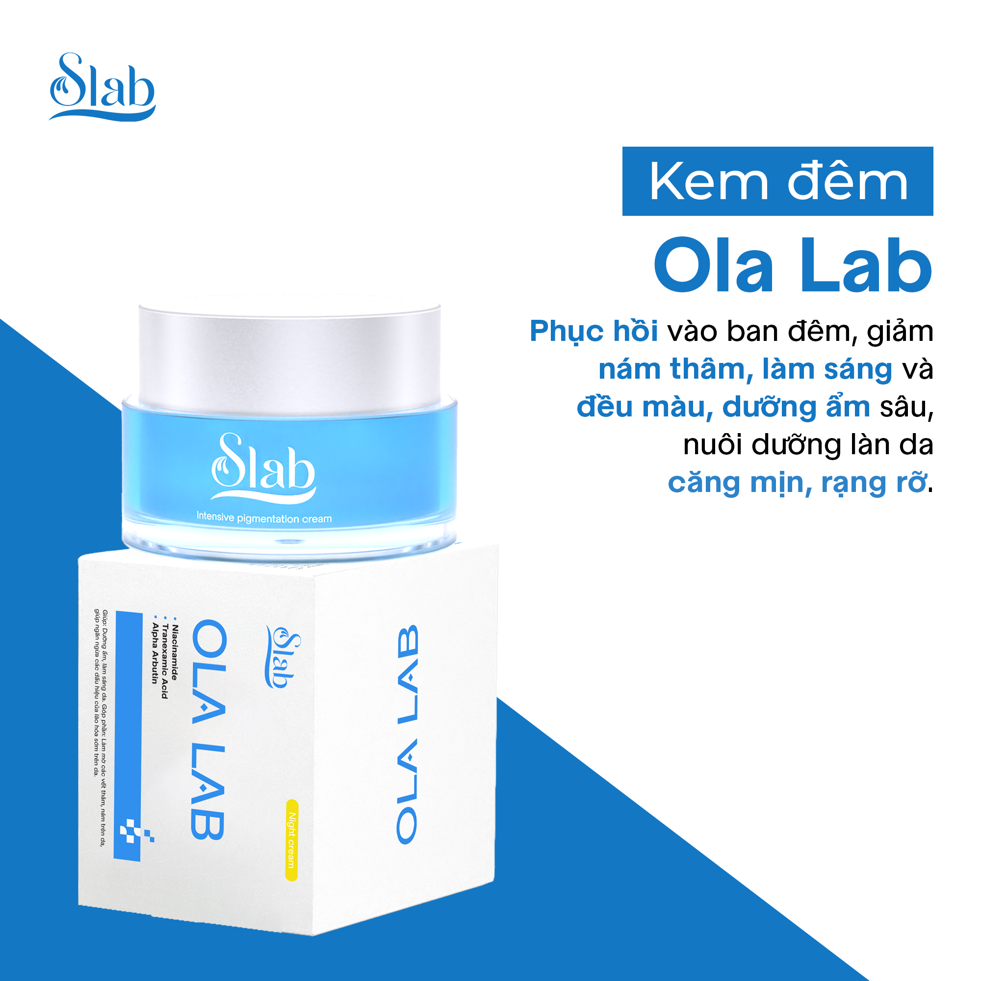 Kem đêm ĐA TẦNG Ola Lab giúp dưỡng ẩm, làm sáng da. Góp phần làm mờ các vết thâm nám trên da, ngăn ngừa các dấu hiệu của lão hóa sớm trên da. Nằm trong bộ Sản Phẩm Bôi Slab